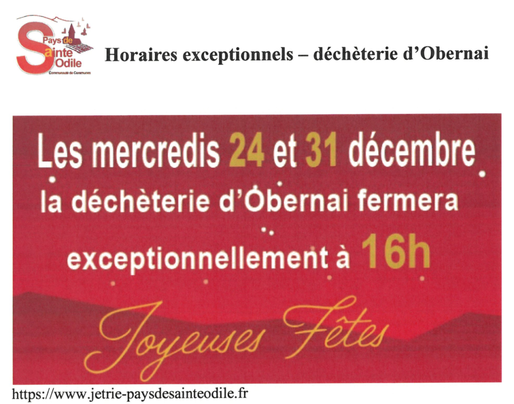Horaires exceptionnels les 24 et 31 décembre de la déchèterie d’Obernai