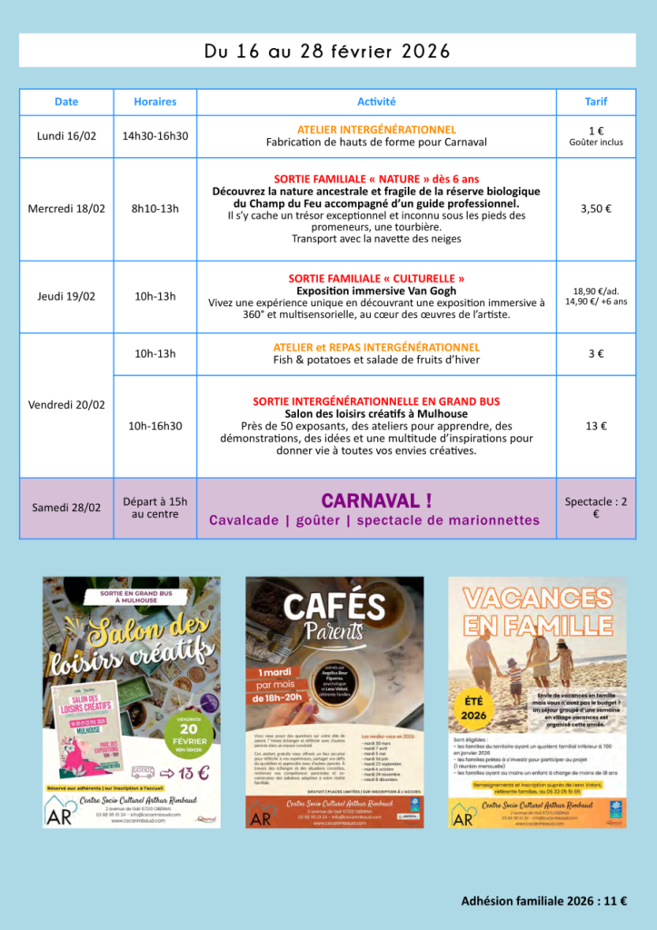 Programme ADULTES – FAMILLES du 16 au 28 février 2026